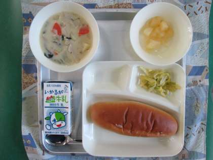 ほうれんそうのクリームシチュー、キャベツのサラダ、洋なし(かんづめ)、パン、牛乳