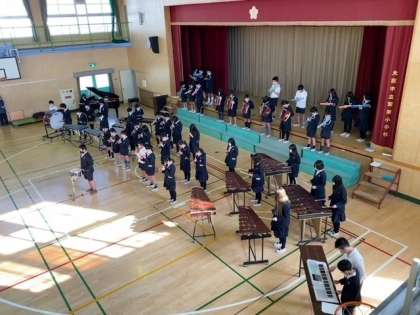 6年生の児童が、明日の「卒業生を祝う会」で、在校生へ贈る「合奏」の練習をしました。