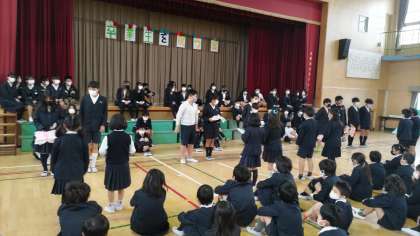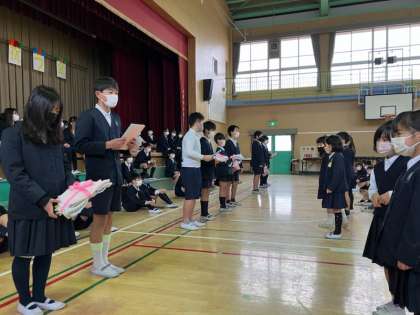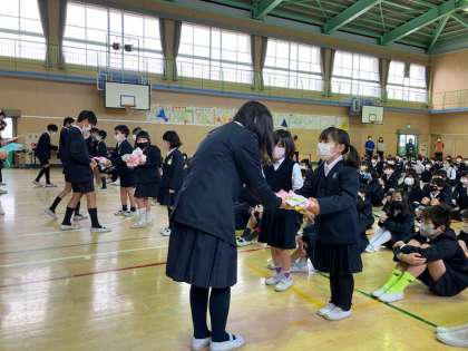 在校生からはメッセージカードが贈られ、6年生からは一人一人が丁寧につくった「ぞうきん」が贈られました。