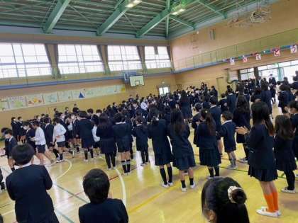 在校生が講堂に集合して、6年生の入場を拍手で迎えました。