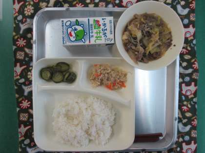 すき焼き煮、もやしとささみのいためもの、きゅうりのゆず風味、ご飯、牛乳