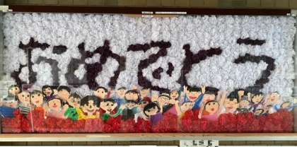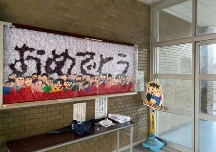 「おめでとう」の文字や「赤と白」の背景は、一つ一つが子どもたちや先生手作りの花で飾られています。