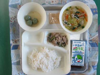 豚肉と野菜のいためもの、すまし汁、きな粉よもぎだんご、ご飯、牛乳