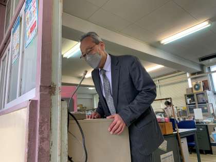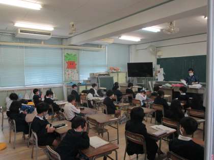 全校児童が揃う最後の朝会は、雨上りの運動場がぬかるんでいるため放送で行いました。