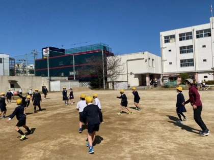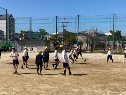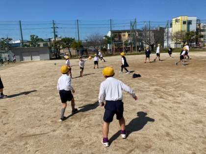 運動場で、子どもたちがドッジボールをして楽しんでいます。
