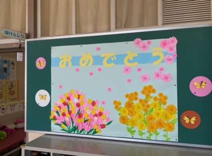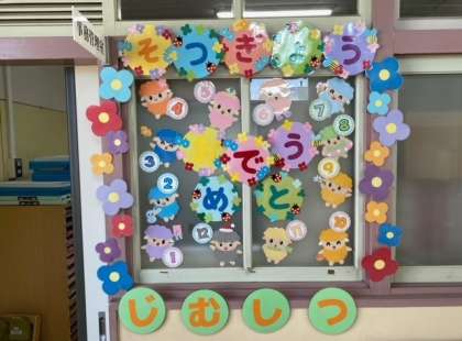 事務室前の掲示も「そつぎょう おめでとう」に変わりました。