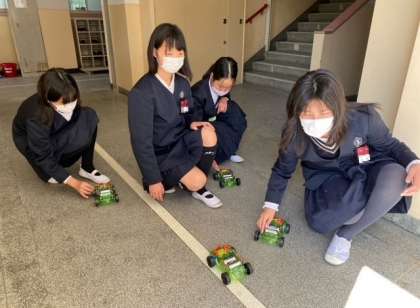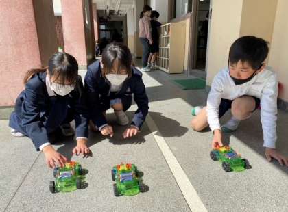 子どもたちが、モーターで動く車をつくり、実際に走らせる実験をしました。