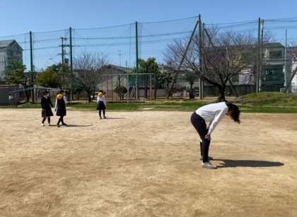 鬼ごっこが終わり、〇〇先生が 運動場の真ん中で疲れ果てています。