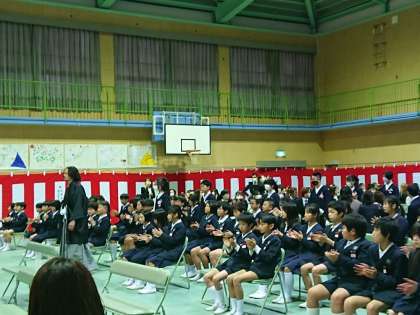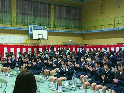 開式の言葉のあと、「国歌斉唱、市歌斉唱、校歌斉唱、学事報告」と続きます。