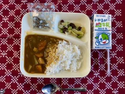 チキンカレーライス[米粉]、ビーンズサラダ、ミニフィッシュ、牛乳
