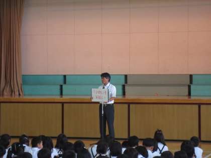 夏休み中は、家のお手伝いをして、家族に協力し助け合いましたか(質問)・・・全員が手をあげていました。そして、一人一人が「いのち」を大切にした夏休みでした。始業式・・・みんなの笑顔が輝いていました。