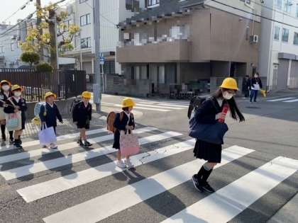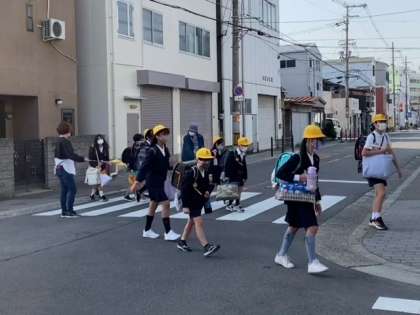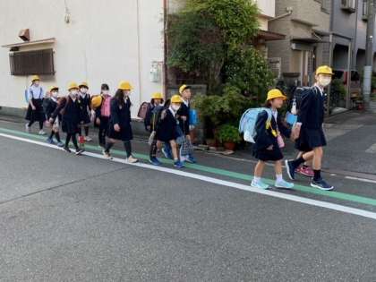 まだ少し緊張感が残りますが、子どもたちが集団登校しています。