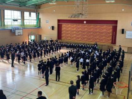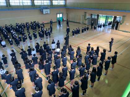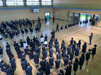 今日の対面式で、1年生の児童が 2〜6年生のお兄さんお姉さんと初めて顔を合わせました。