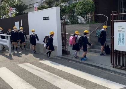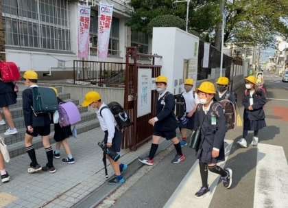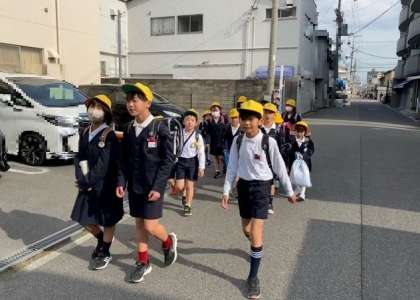 集団登校の子どもたちが、班長さんを中心に元気よく朝のあいさつをして通り過ぎていきます。