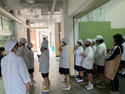 6年生は 行儀よく給食室前で手をあわせています。