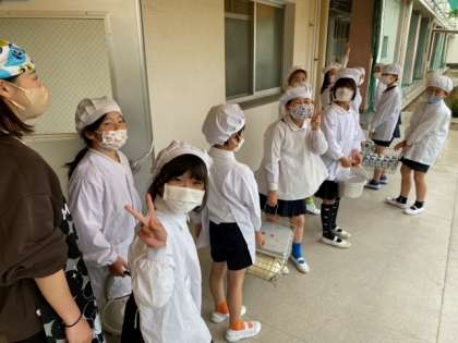 各学級の給食当番の児童が、手洗いをしてから、給食室へ食器や食缶・牛乳などをとりに来ました。