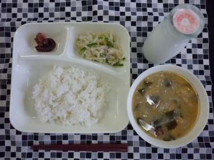 たこのやわらか煮、みそ汁、切り干しだいこんの梅風味、ご飯、牛乳