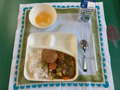 一口トンカツがのったカレーライスです。子ども達に好評な献立です。