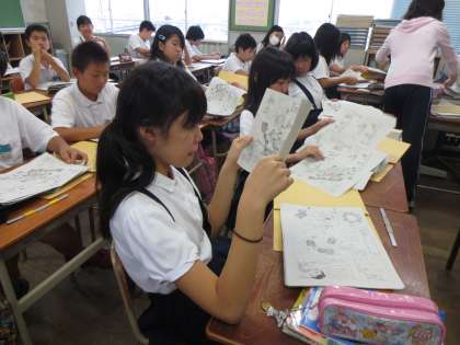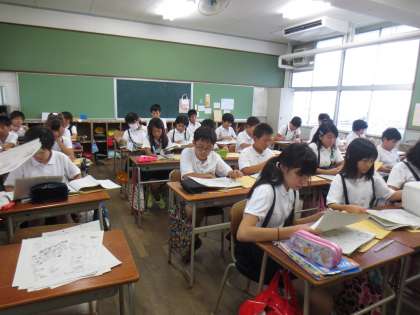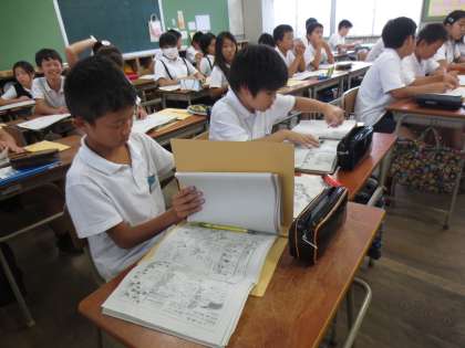 6年2組の教室では、日本の歴史資料をファイルにとじていました。これは2学期の社会科の学習の準備をしています。イラストが多く描かれていてわかりやすく、歴史に興味がでる内容でした。
