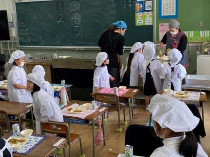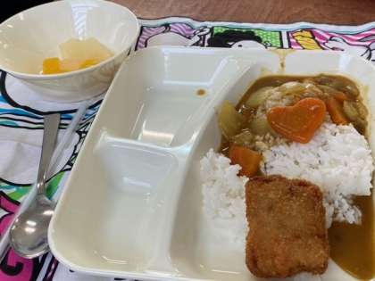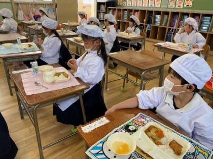 1年生の教室では、「いただきます」のあいさつのあと、子どもたちが、おいしそうにカツカレーライスを食べていました。