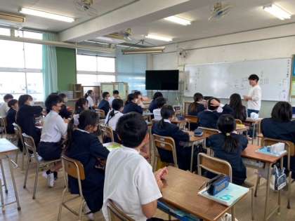6年生2組の 教科担任制(英語科・理科)の授業のようすです。