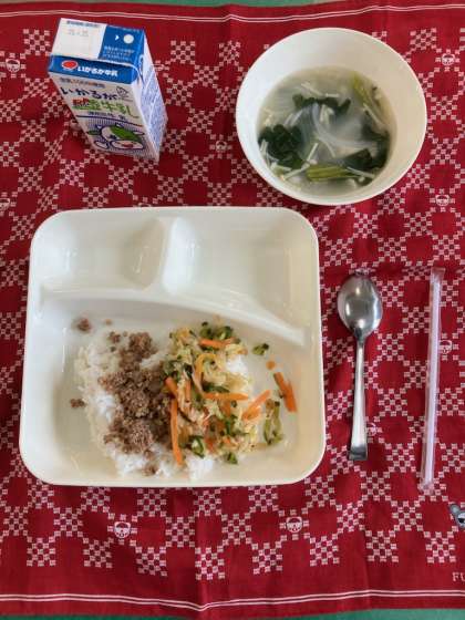 牛ひき肉・豚ひき肉をにんにく、ごま油の風味で甘辛くいためたものと、きゅうり、にんじん、切り干しだいこんを味付けしたものをご飯の上にのせて食べます。