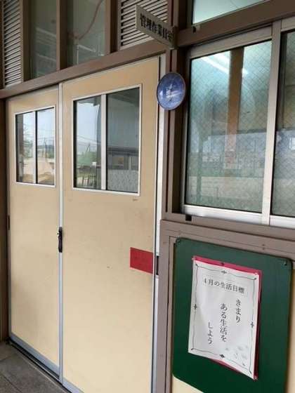 玄関を入ってところにある 管理作業員室の前に、4月の生活目標「きまりある生活をしよう」が掲示されています。