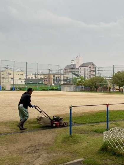 前の運動場では、管理作業員さんが芝生の手入れをしていました。