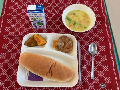煮こみハンバーグ、コーンとキャベツのスープ、焼きかぼちゃ、パン、ブルーベリージャム、牛乳