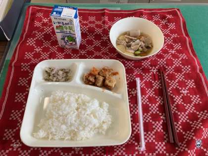 まぐろのオーロラ煮、豚肉と野菜の煮もの、キャベツの赤じそあえ、ごはん、牛乳