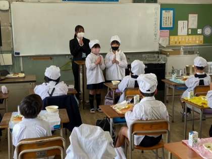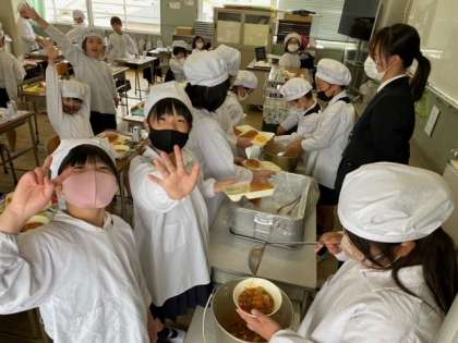 当番の子どもたちが、教育実習生と給食の準備をしています。