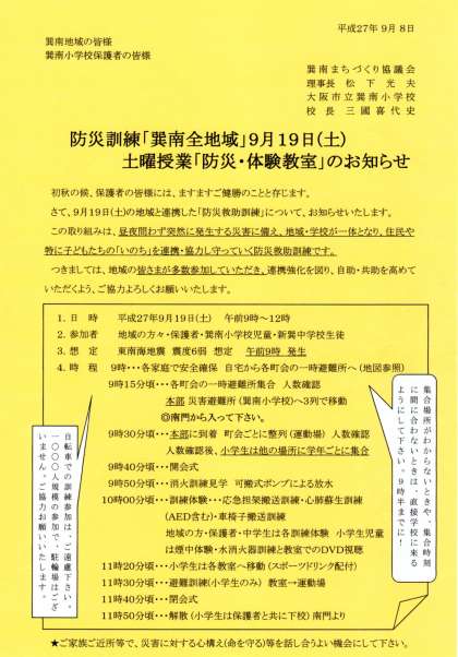 9/7 地域防災訓練・土曜授業のお知らせ