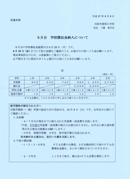 9月分の学校徴収金振替日は、9月28日(月)です。よろしくお願いいたします。
