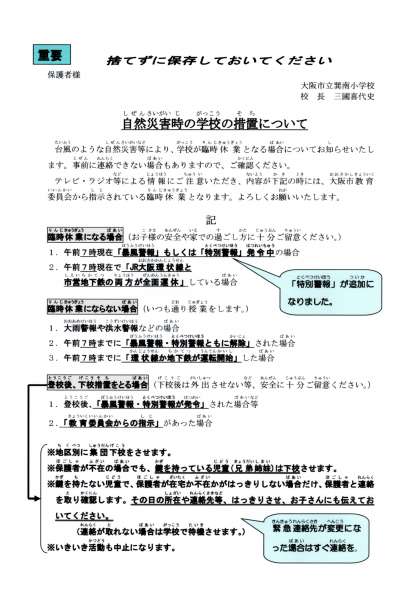 ●明日の朝(7時の時点)、大阪に暴風警報が発令されていれば学校は臨時休業になります。
