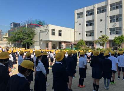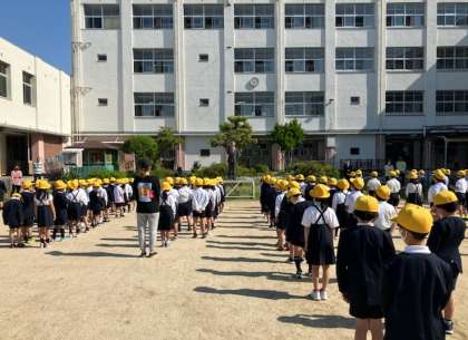 校長先生と元気よく朝のあいさつをして話を聞きました。