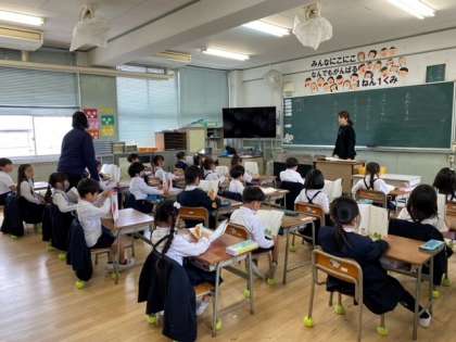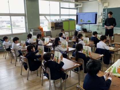 子どもたちが、教科書の「あめですよ」を、よいしせいで、おおきなこえで、まちがえずに、ゆっくりと音読していました。