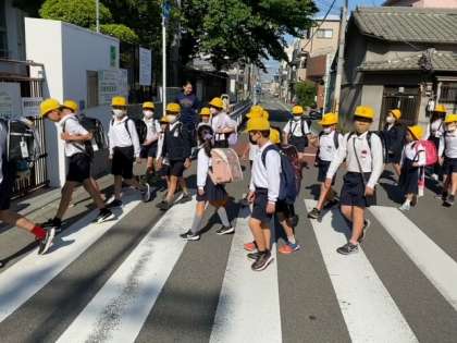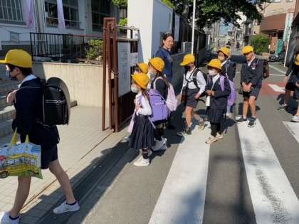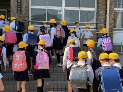 3年生・4年生の子どもたちは、遠足なので大きなリュックを背負って登校しています。