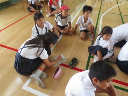たて割班で輪になり、相談をしながら答えを考えています。
