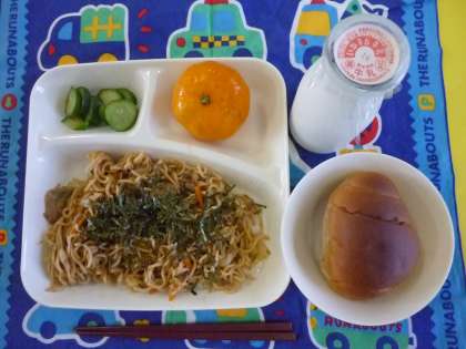 焼きそば、あっさりきゅうり、みかん(冷)、黒糖パン小、牛乳