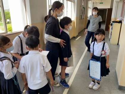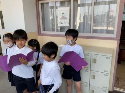 校長室の前で、2年生の児童が1年生の児童に 大きな声でゆっくりとお部屋の説明を読んでいます。