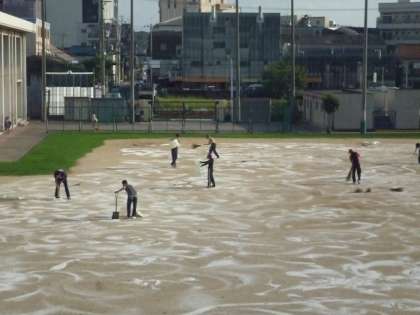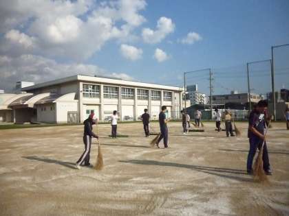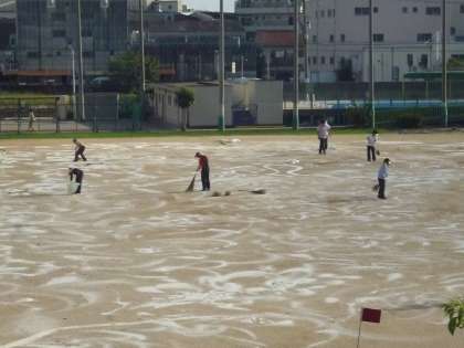 雨が続きましたが、今週から運動会の練習が始まりました。今日は、久しぶりに晴れた一日になりました。予定通り、職員で「にがりまき」をしました。水に溶けやすい白い色をしたにがりは、運動場の表面安定剤として使用されます。運動場の砂ぼこり防止になります。来週からは、子どもたちが、元気よく運動会の練習をすることを期待します。