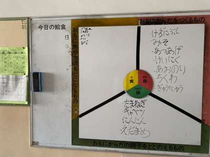 給食室横には明日の献立の三色食品群が書いてありました。
