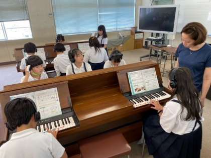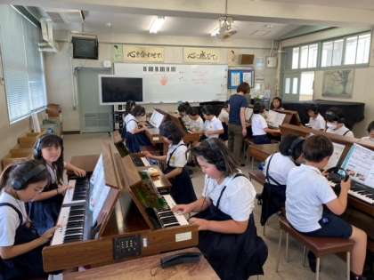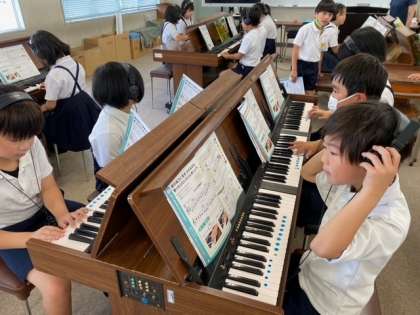 音の高さに気をつけながら、子どもたちがオルガンを弾いています。