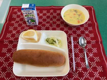 コーンクリームシチュー、キャベツときゅうりのサラダ、かわちばんかん、おさつパン、牛乳