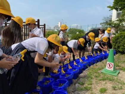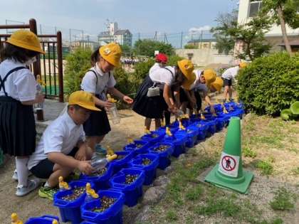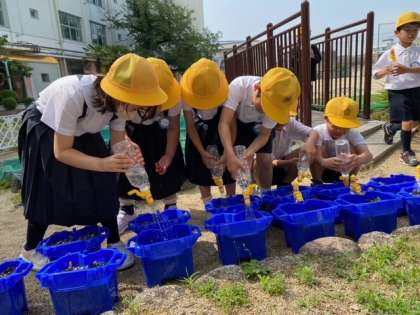 1年生の児童が、「アサガオ」にたっぷりと水をあげていました。