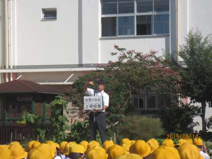 今週末の9月19日(土)に巽南地域の「防災訓練」及び土曜授業をします。この防災訓練は、昼夜問わず突然に発生する災害に備え、地域・学校が一体となり、住民や特に子どもたちの「いのち」を連携・協力し守っていく防災救助訓練です。児童のみなさんは、この訓練を通して、巽南地域の方々に守られていることを、しっかりと意識して参加して下さい。