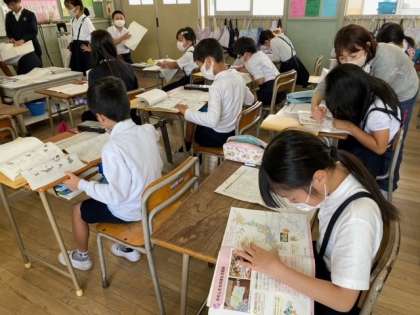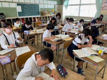 日本の47都道府県を覚えています。地図を見てプリントに都道府県名を書いています。