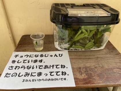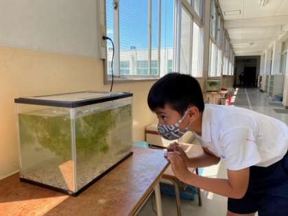 5年生のメダカの水槽では、もうすぐ卵が産まれるそうです。児童が興味深く見ていました。