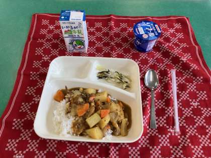 牛肉と大豆のカレーライス、キャベツのひじきドレッシング、ヨーグルト、牛乳