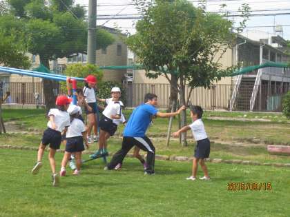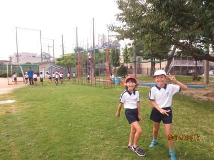 休み時間に芝生の上で遊んでいます。子どもたちはよく芝生の上を走りまわっています。また、バッタなどの虫も多く、虫集めに熱中している子どももいます。